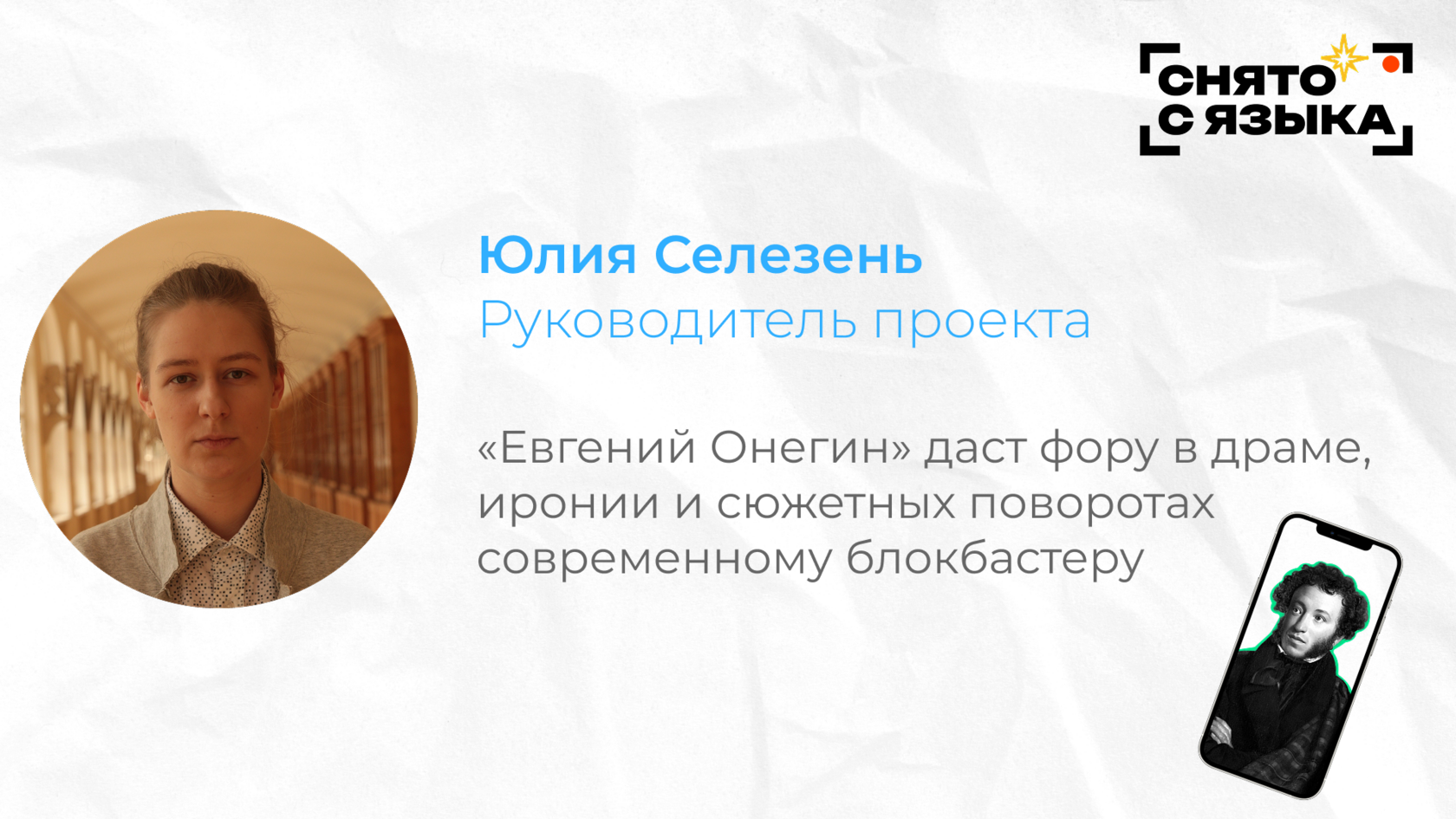 В проекте «Снято с языка» мы объединяем современные технологии и визуальное искусство с размышлениями о языке и литературе. Далеко не всегда морфемный разбор и Иван Сергеевич Тургенев побеждают соцсети, смешные ролики или игры. Задача педагога — понять, почему это происходит и как объяснить ученику, что «Евгений Онегин» даст фору в драме, иронии и сюжетных поворотах современному блокбастеру. В чем сила Пушкина и почему мы все — его наследники, а умение обособлять деепричастия — не прихоть учителя, но навык, который пригодится в жизни даже с приходом ИИ. Почему герои романов, которым 200 лет, отличаются от нас лишь сюртуком, но не мыслями, переживаниями, потерями и надеждами.