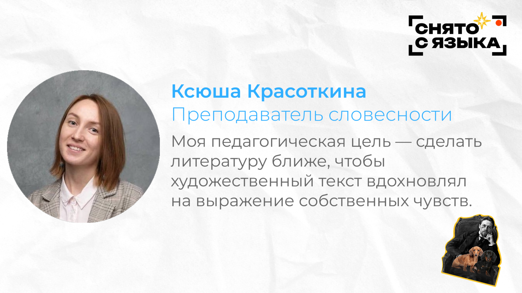 Сегодня делимся рассказом нашего эксперта и члена жюри Ксюши Красоткиной о том, как она стала педагогом и почему присоединилась к конкурсу «Снято с языка»!